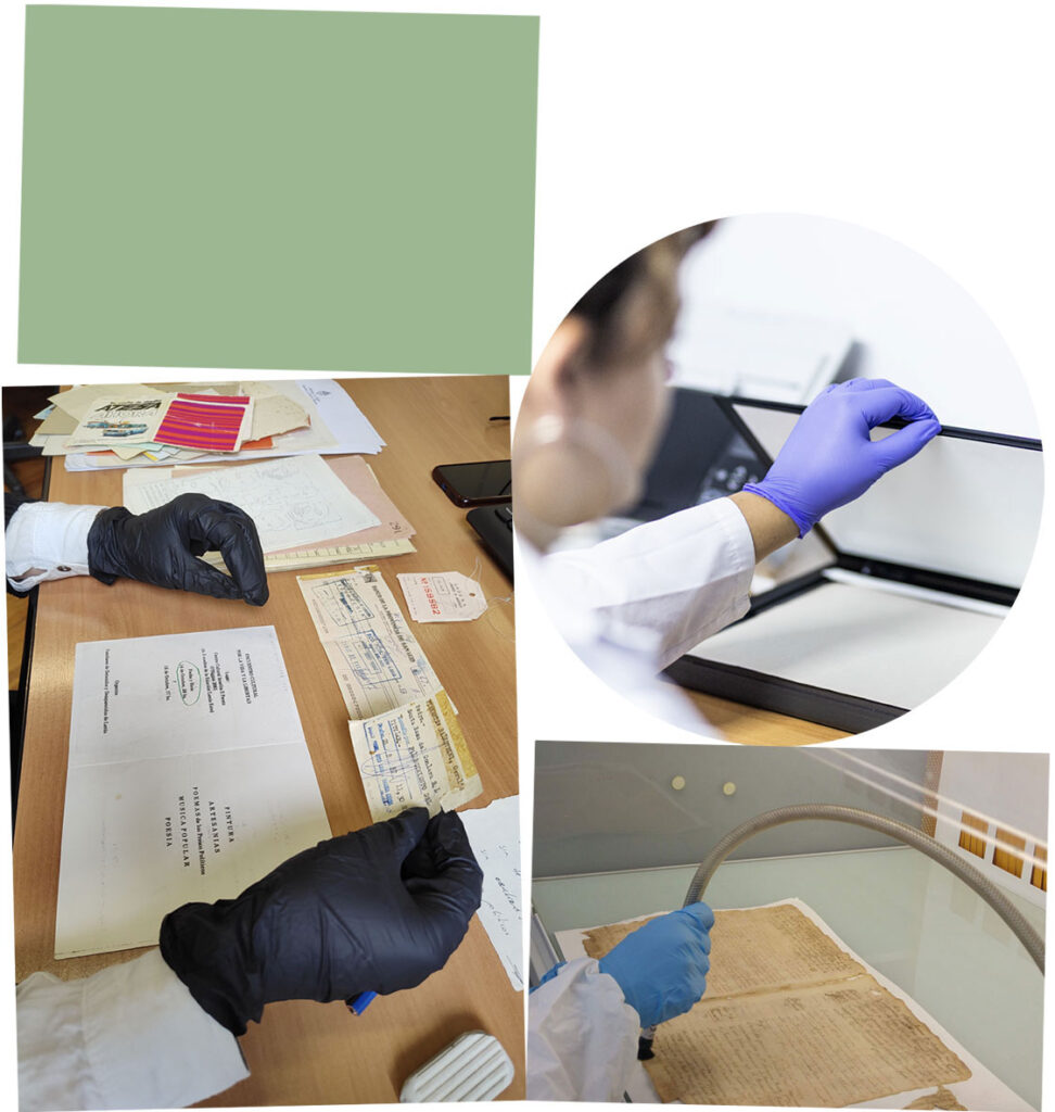 Realizamos conservación preventiva, restauraciones en papel y ayudamos a mejorar las condiciones de guarda.